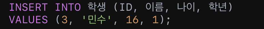 VALUES (3, '민수', 16, 1);