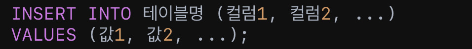 INSERT INTO 테이블명 (컬럼1, 컬럼2, ...)